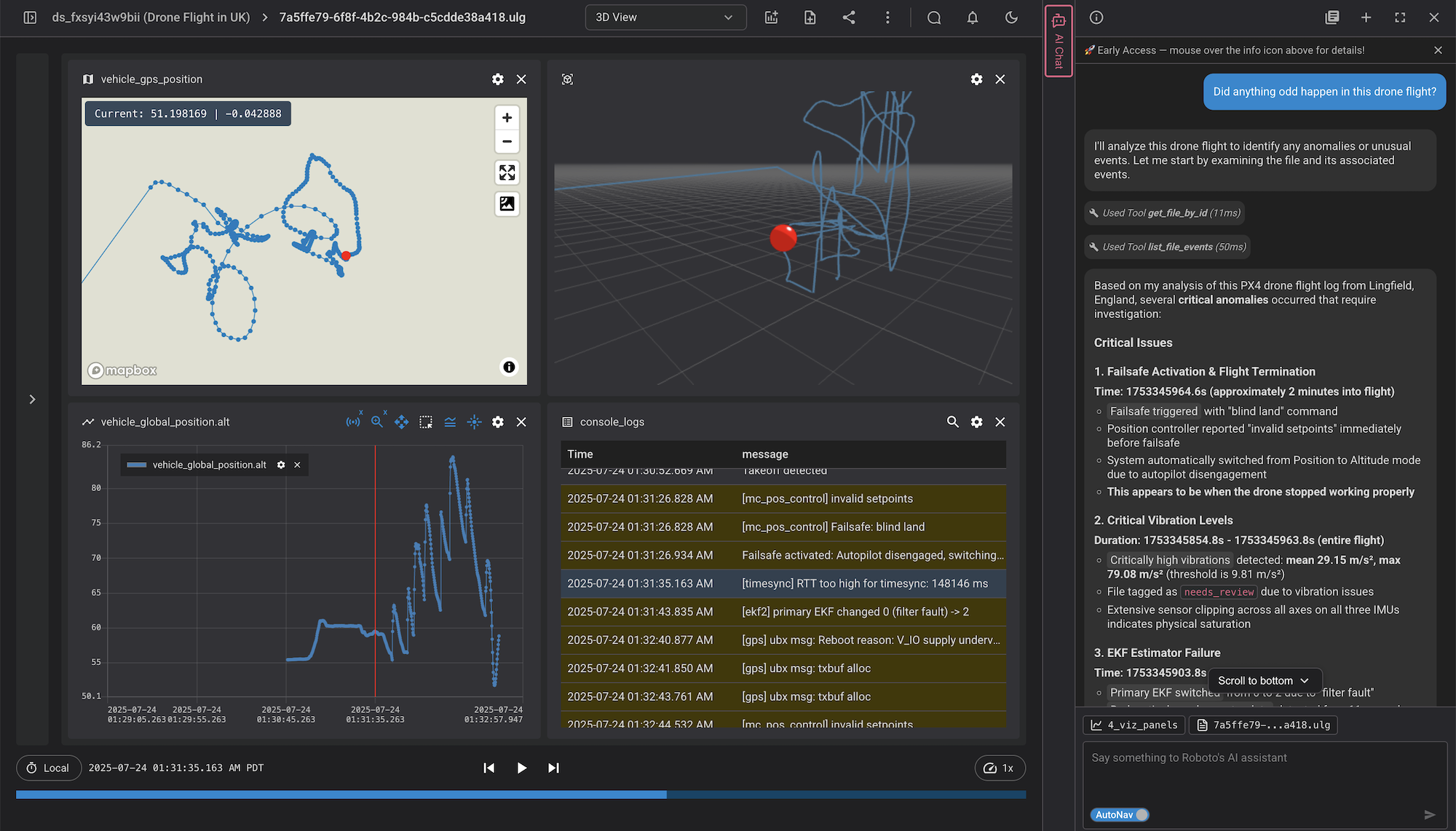 Turn complex robotics data into insights in seconds. Our AI models summarize logs, surface anomalies, and highlight key events - so you can triage issues automatically and root cause them faster.
